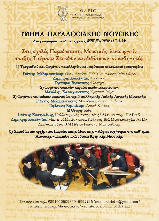 Το ωδείο μας έπειτα από την 20 χρονη και πλέον ευδόκιμη παρουσία στον χώρο της παραδοσιακής και λαϊκής μουσικής, από το φετινό σχολικό – ακαδημαϊκό έτος, συνεχίζει την προσπάθειά του με το νέο νομοθετικό πλαίσιο της πρόσφατης αναγνώρισης των σχολών παραδοσιακής (λαϊκής) μουσικής από την πολιτεία με το ΦΕΚ/Β/7275/17-1-22. Με το παραπάνω νομοσχέδιο το τμήμα της παραδοσιακής μουσικής αποκτά την αναγνώριση που του έπρεπε και έτσι δίδεται η ευκαιρία να χορηγούνται τίτλοι σπουδών (πτυχία και διπλώματα) αναγνωρισμένα από το κράτος. Επικουρικά διδάσκονται και 13 υποχρεωτικά μαθήματα για την καλύτερη κατανόηση της γνώσης του αντικειμένου. Ο σπουδαστής επίσης θα έχει την ευκαιρία να συμμετέχει ενεργά στα παραδοσιακά σύνολα του ωδείου μας (παραδοσιακή χορωδία-ορχήστρα, ορχήστρα λόγιας μουσικής της καθ ημάς ανατολής κ.α Στο παραπάνω τμήμα διδάσκουν καταξιωμένοι στον χώρο μουσικοί, με πολυετή διδακτική εμπειρία και παιδαγωγική κατάρτιση.